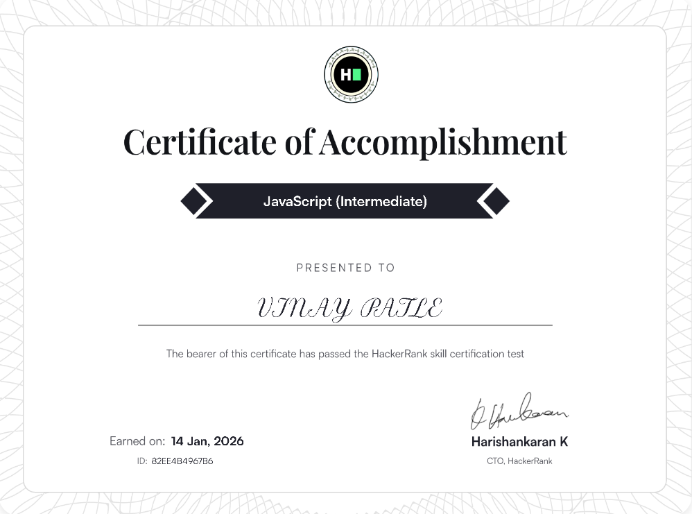 Certified in JavaScript programming, covering fundamentals, functions, objects, and asynchronous programming.